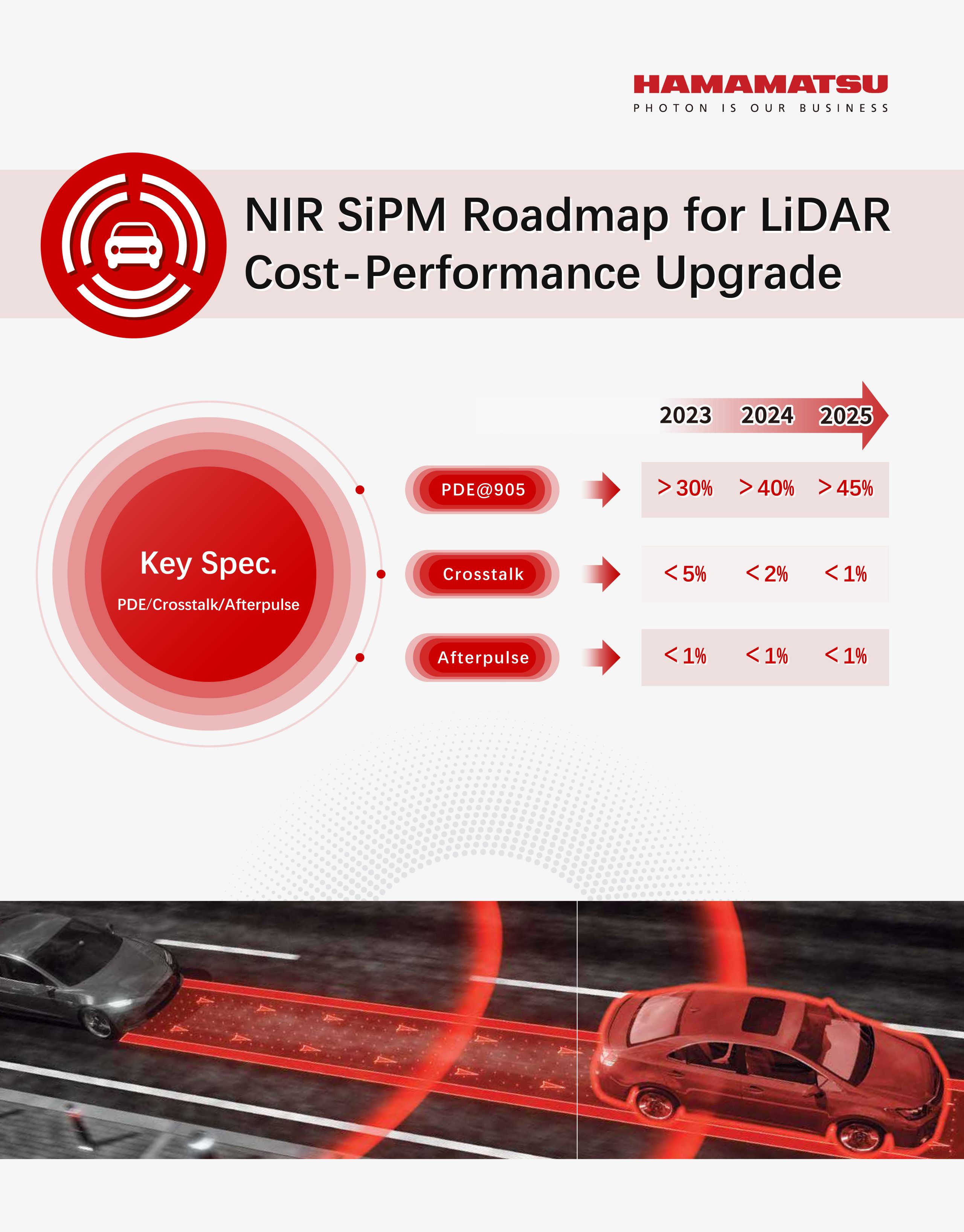 激光雷达作为自动驾驶感知层满足功能性安全的必备传感器,近几年一直在加速发展。而作为其中核心器件供应商,滨松的器件更迭也达到了前所未有的速度。探测器端的SiPM/MPPC产品,PDE也从9%提升到如今的30%,激光器端的产品,我们的EEL激光器推出了高功率的5堆叠产品,有1ch和8ch的标准品。