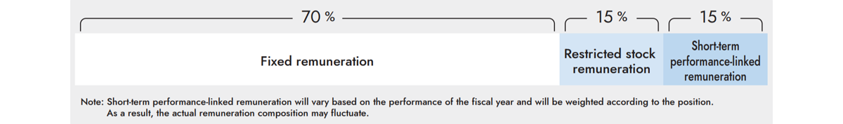 * 短期业绩挂钩薪酬可能会根据每个财年的业务业绩而增减。因此,实际比率可能会发生变化。此外,同时还身为员工的负责人由于领取工资的关系,因此可能不适用上述比率。