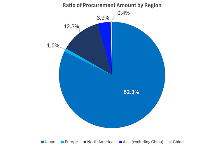 就各地区的产品材料支出金额而言,日本供应商占总支出的 82.3%,其次是北美(12.3%)和亚洲(中国除外)(3.9%)。