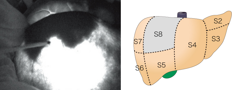 使用术中超声检查法穿刺显性格林森氏鞘,并注射 ICG。夹住门静脉并进行观察。