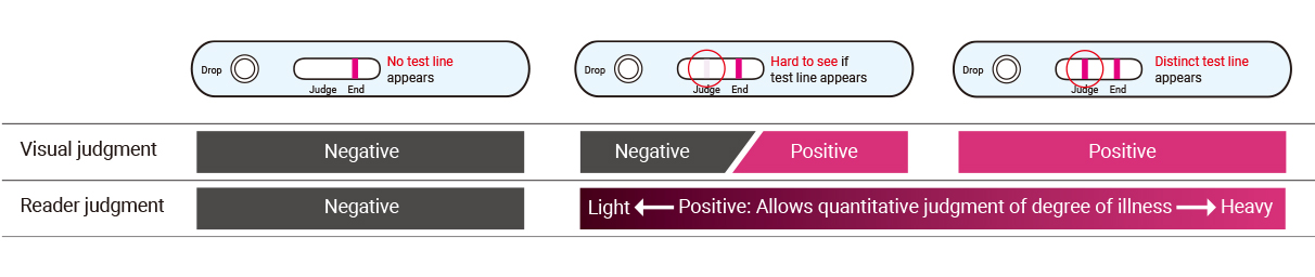 使用免疫色谱法的检测结果通常通过目视检查来判断,但使用高灵敏度读取仪可以凭借良好准确性的检测出疾病,即使彩色线非常细。由于彩色线的强度与样品中的分析物量成比例,因此提高读取仪的灵敏度可以从极少量样品中获得良好的检测结果,从而减轻被检测者的负担。