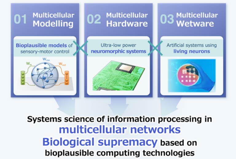 为实现这一目标,该项目汇集了众多信息科学、生物工程、生物学和电子学等不同领域的研究人员。我们设定了三个重点研究领域:多细胞建模(基于生物实验的信息处理模型和学习规则的制定)、多细胞硬件(硬件功能的实现及在机器人中的应用)、多细胞湿件(利用培养细胞和人工重建生物功能验证数学模型和学习规则)。通过以上领域,我们正在挑战展示生物霸权,旨在利用生物学原理开发下一代信息和通信技术。