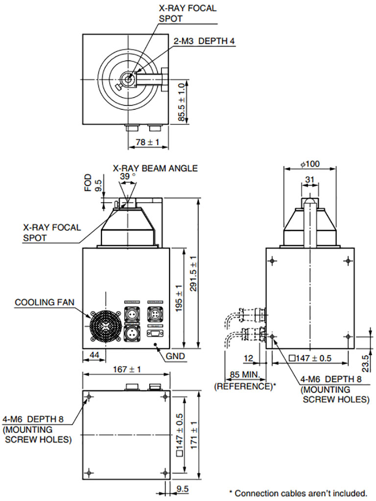 管电压:20 至 90 kV,管电流:0 至 200 uA,最大输出:8 W,X 射线焦点尺寸:5 um,串行端口控制:RS-232C