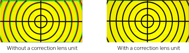 W-VIEW GEMINI在长波长路径中有一个校正透镜装置,可以改善由色差引起的两个波长图像的放大率差异。右图显示了校正透镜装置改善了由色差引起的放大倍率差异的示例。