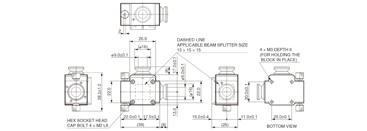 A10035-90 是一款用于固定 15 mm 立方型分束器的支架模块。模块底部设有用于固定的 M3 螺钉孔。