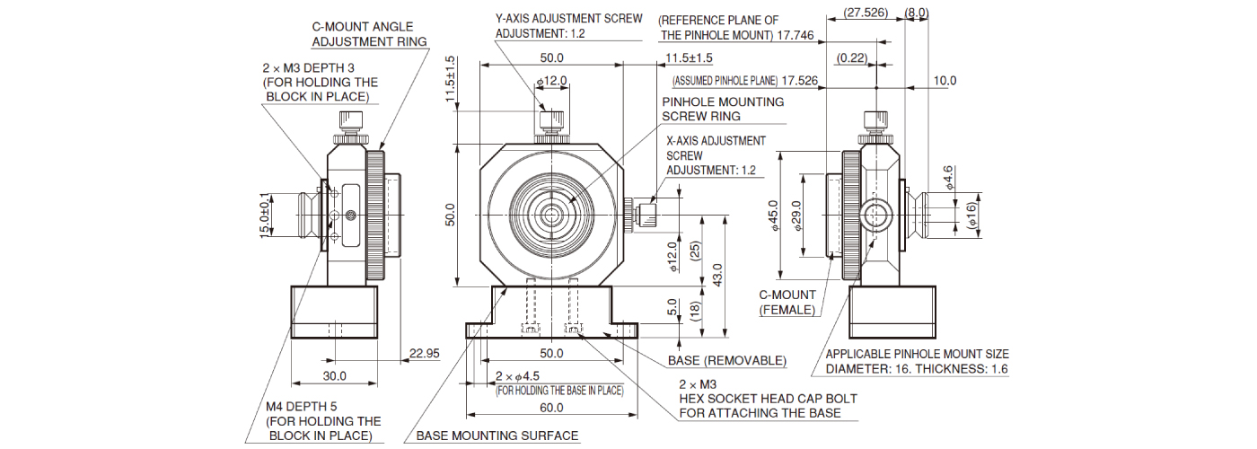 A11027 是一款用于安装针孔的支架模块。螺钉可用于调节针孔在 XY 方向的位置。内置透镜可准直穿过针孔的光,并将光聚集到光电检测器上。