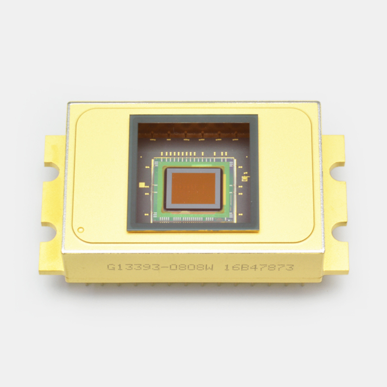 G13393-0909W 具有混合结构,由 CMOS 读出电路(ROIC:读出积分电路)和背照式 InGaAs 光电二极管组成。每个像素都由一个 InGaAs 光电二极管和一个 ROIC 组成,通过铟柱进行电气连接。ROIC 中的时序发生电路提供模拟信号输出和 AD-TRIG 输出,只需提供数字输入即可获得这些输出。G13393-0909W 具有 640 × 512 像素,以 20 μm 的间距排列,信号从单个视频线读出。入射到 InGaAs 光电二极管上的光转换为电信号,然后通过铟柱输入到 ROIC 中。ROIC 中的电信号转换为电压信号,然后通过移位寄存器从视频线中顺序输出。G13393-0909W 采用金属封装和一个两级电子制冷器密封在一起,可实现稳定的运行。