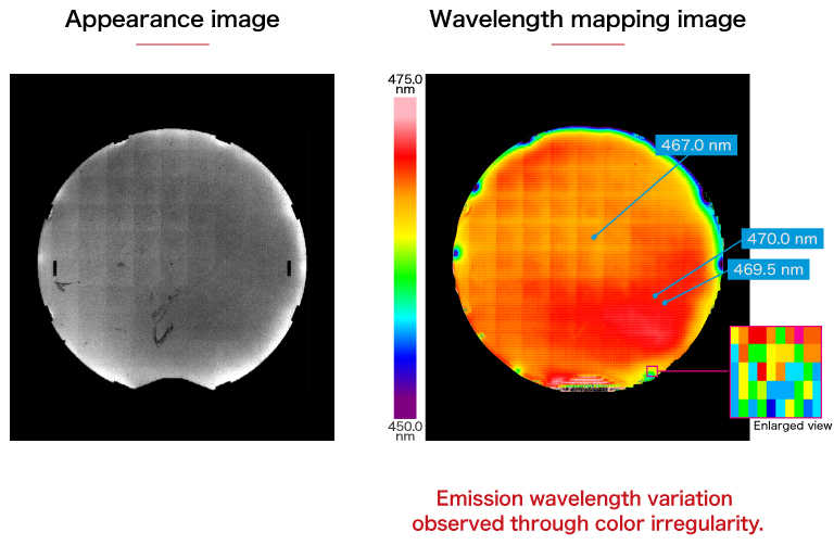 MiNY PL 能够以高达 ±0.5 的精度检测波长变化,并将芯片之间的发光波长差异转换为映射图像,从而将晶圆内发光波长的变化差异可视化为色调不均匀。这样就能更加精确而高效地测定晶圆质量。